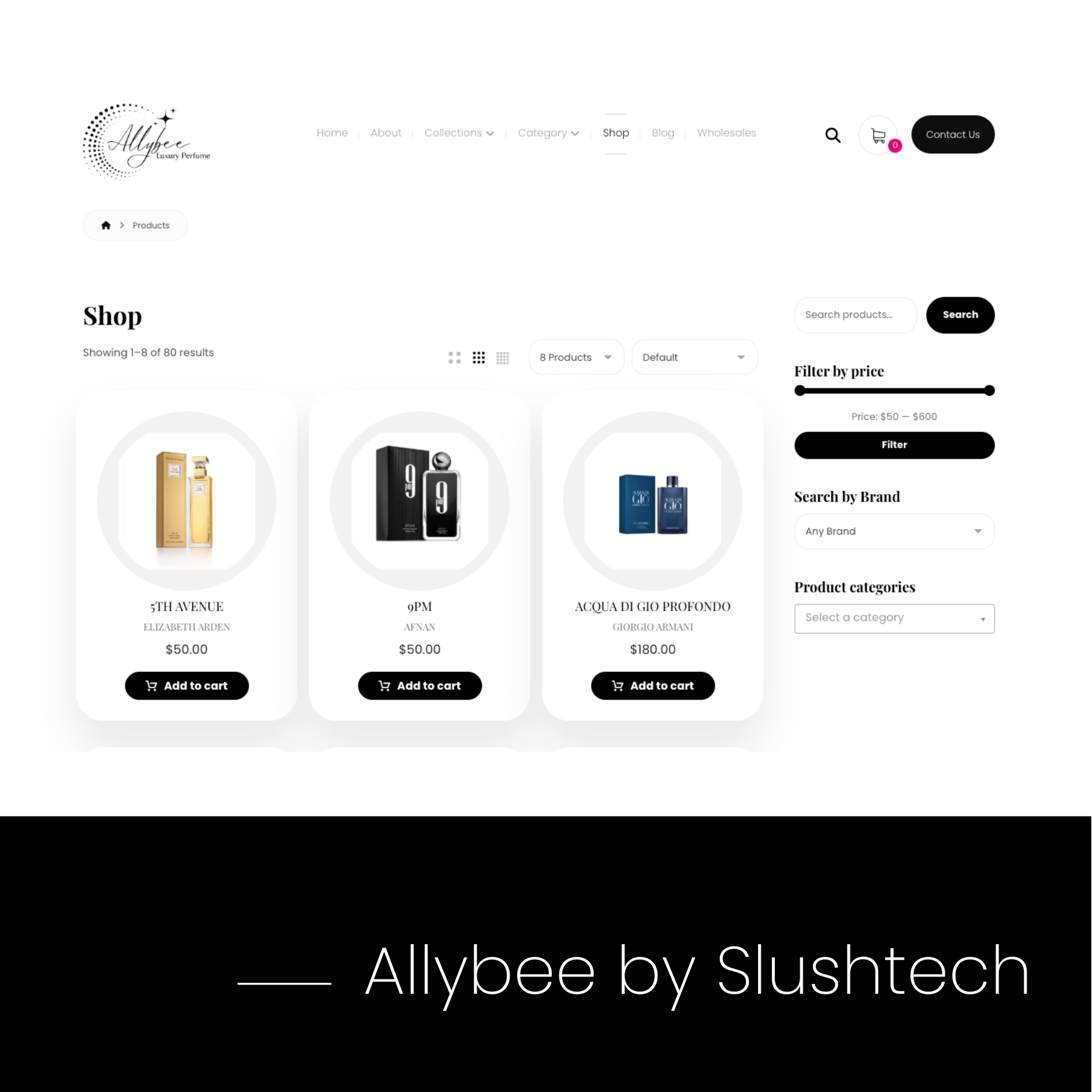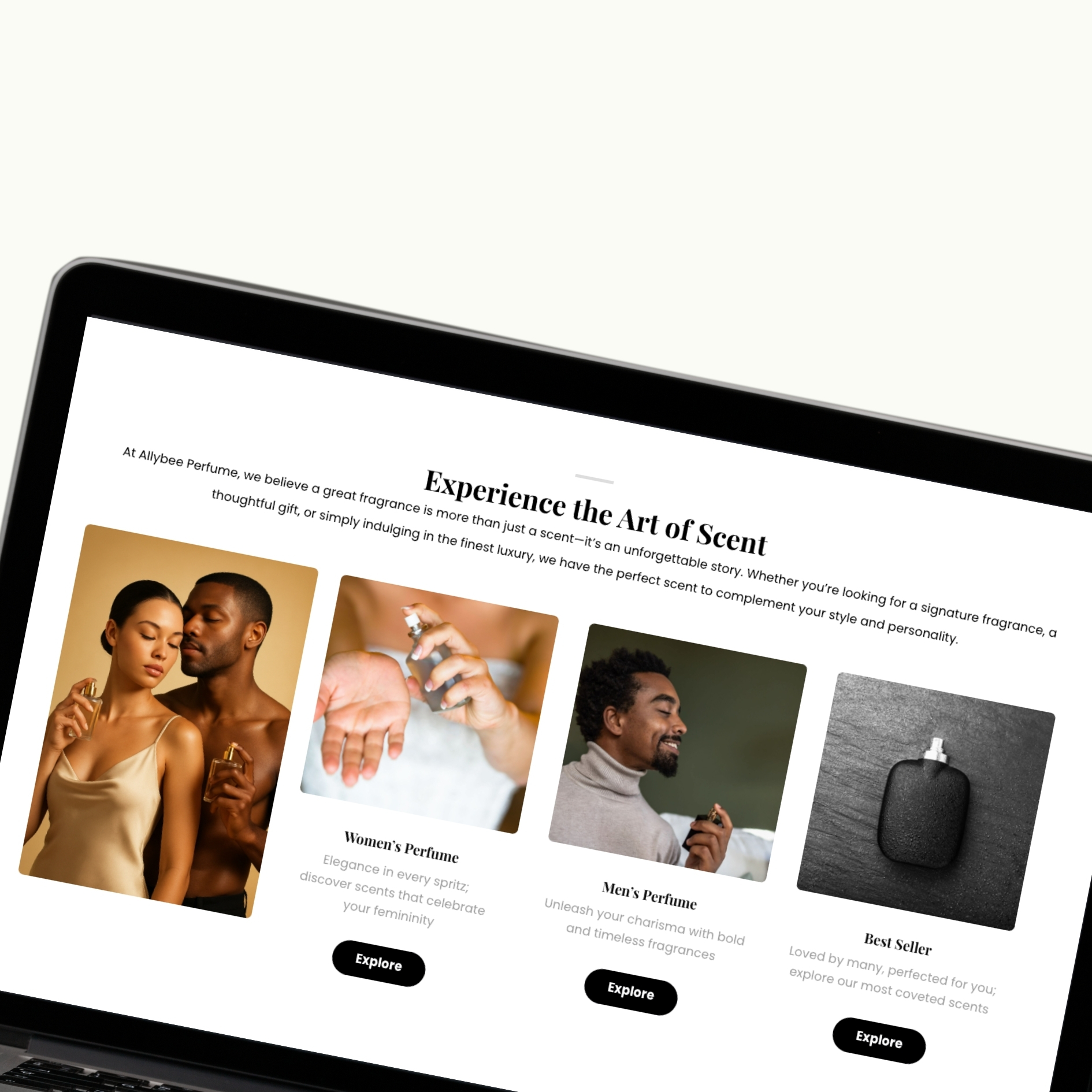 Allybee Perfume is a clean, modern e-commerce site for luxury and designer fragrances. It features a simple navigation menu with curated categories like Eau de Parfum, Eau de Toilette, and niche scents. The homepage highlights signature collections and best sellers. Product listings show clear pricing and quick add-to-cart options.